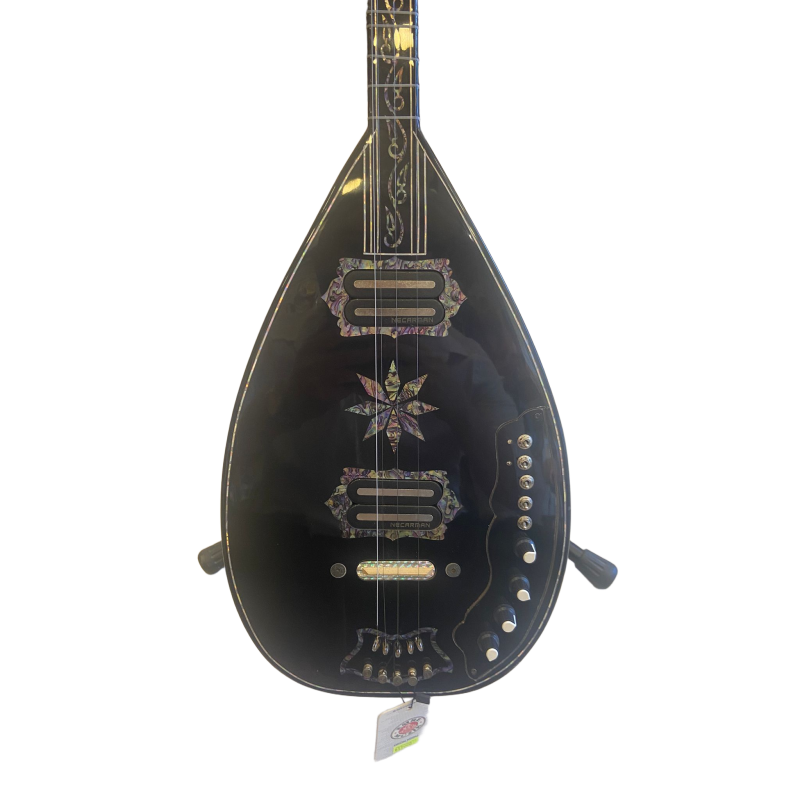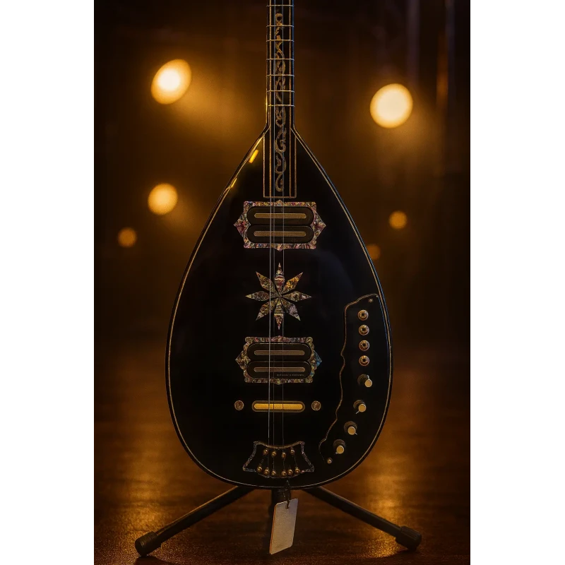 Siyah parlak kaplama ve sedef (abalone) kakma detaylarıyla öne çıkan bu elektro bağlama; çift manyetik yapısı ve Lesli (rotary/chorus tarzı) ton modu sayesinde sahnede net, stüdyoda temiz ve gürültüsüz bir sinyal sunar. Gövde üzerindeki ergonomik volume/ton düğmeleri ve mini anahtarlar, repertuvar geçişlerinde hızlı ton ayarı sağlar. Dayanıklı donanım, stabil akort ve uzun ömürlü kullanım için optimize edilmiştir.